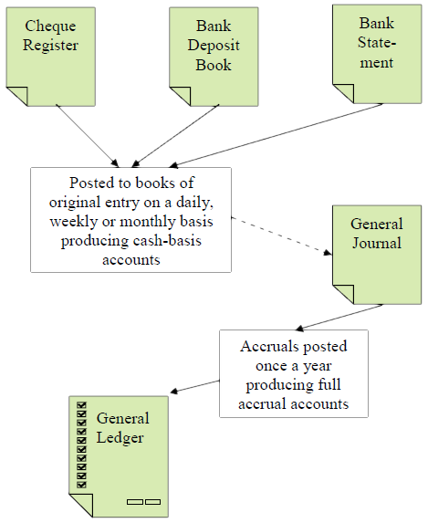 This system for maintaining the books of original entry is extremely common in small enterprises, particularly those that use a contract bookkeeper to prepare one set of full accrual accounts once a year – typically to produce the financial statements for use in preparing the income tax return.