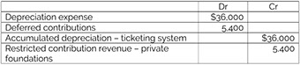 The symphony orchestra receives $18,000 as a grant from a private foundation to be used to defray part of the cost of a new computerized ticketing system. The system costs $120,000 in total, and is depreciated at 30% per year on a declining balance. Receipt of grant and purchase of equipment