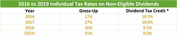 The Small Business Tax Rate is set to decrease each year up to and including 2019. As a result, non-eligible dividend tax credits will be revised as shown below to assist with integration: