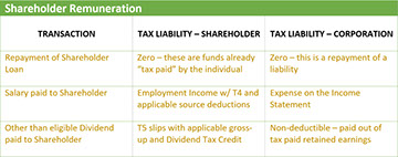 As a recap, the following chart shows different ways a shareholder can receive remuneration from a corporation and the tax implications of each. Use this as a reference guide.