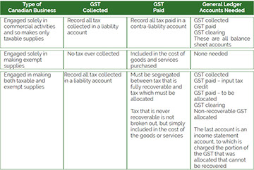 The way in which GST is accounted for and the accounts to be set up in the general ledger to account for it depend on the nature of the enterprise but can be summarized in the table which follows. It should be noted that some computerized accounting systems have built in Sales Tax components, and therefore only one account is required.