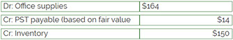 Sometime later, Acme removes 10 cartridges from inventory and installs them in its own printers. The retail value of the cartridges is $200.00, their cost is $150.00 and the provincial PST rate is 7%